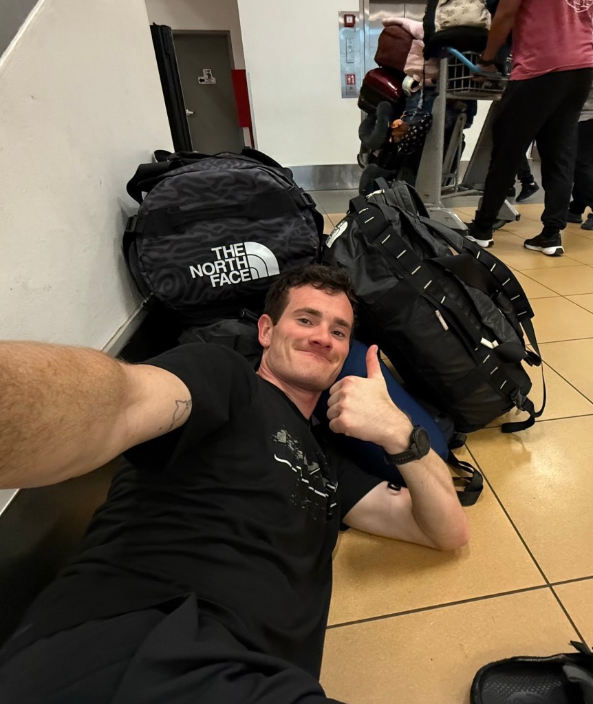 this is a behind-the-scenes of what long days of traveling looks like: laying on the airport floor until you can re-check in your bags to the next destination running on 2 hours of sleep