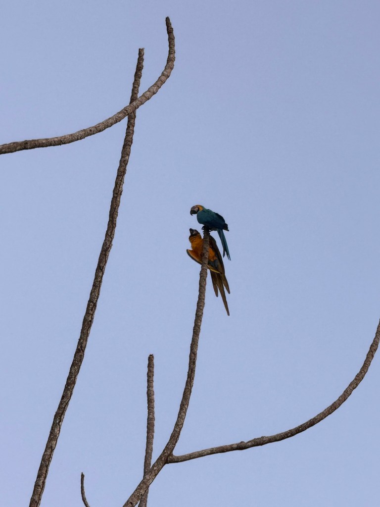 a mom and baby blue-and-yellow macaw hanging out at sunset